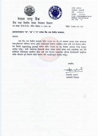 केन्द्रीय बैंकद्वारा बैंक तथा वित्त कम्पनीलाई दिएको निर्देशन पत्रमा भनिएको छ– ‘बैंक तथा वित्तीय संस्थाले २०७७ असार ३१ गतेसम्म कायम रहेको संस्थापक सेयरधनी यसैसाथ संलग्न ढाँचा बमेजिमको विवरण प्रमाणित सेयर धनी दर्ता किताब समेत० यस बैंकको रिपोर्टिङ पोर्टलमार्फत २०७७ भदौ १५ गतेभित्र उपलब्ध गराउन अनुरोध गर्दछु ।’