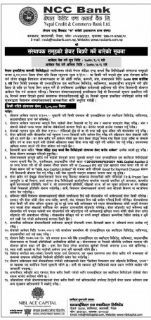 नेपाल इन्स्योरेन्स कम्पनी लिमिटेडको स्वामित्वमा रहेको एनसीसी बैंकको ५ लाख कित्ता शेयर प्रति कित्ता न्यूनतम मूल्य १ सय १० रूपैयाँमा बिक्री गर्न लागेको जनाएको छ ।