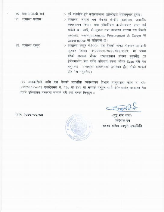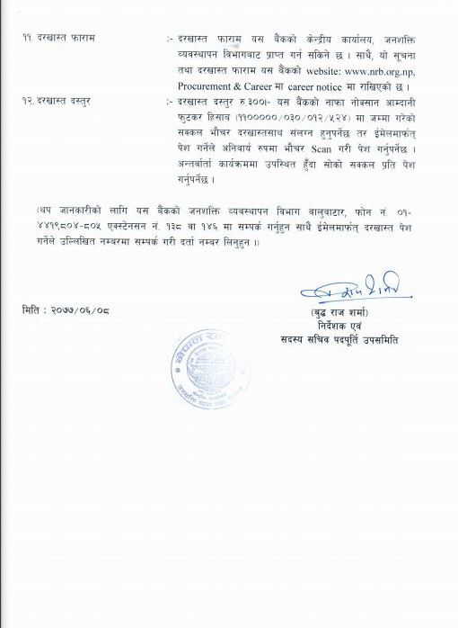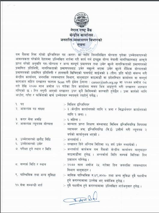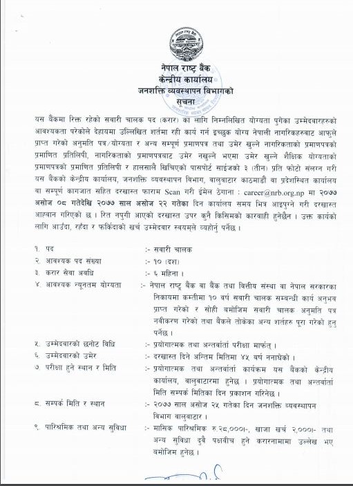 बैंकले सिभिल इन्जिनियरका लागि सिधै अन्तरवार्ताबाट नियुक्त गर्नेछ भने चालकका लागि भने प्रयोगात्मक र अन्तरवार्ता हुने राष्ट्र बैंकले जनाएको छ ।