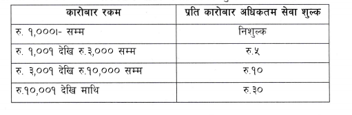 राष्ट्र बैंकका अनुसार एक हजारसम्मको कारोबार गरेमा निशुल्क । एक हजार एकदेखि ३ हजारसम्म ५ रुपैयाँ, तीन हजार एकदेखि १० हजजारसम्म १० रुपैयाँ र १० हजार एकदेखि माथी कारोबार गरेमा ३० रुपैयाँ शुल्क लाग्ने जनाएको छ ।