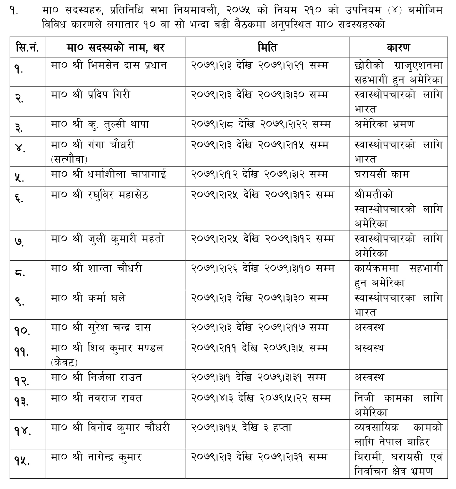 उनका अनुसार घरायसी कामका लागि १२ जेठदेखि २ असारसम्म धर्मशीला चापागाइँ, श्रीमतीको स्वास्थ्योपचारका लागि अमेरिका जान २५ जेठदेखि १२ असारसम्म रघुवीर महासेठ, स्वास्थ्योपचारका लागि अमेरिका जान २५ जेठदेखि १२ असारसम्म जुली कुमारी महतो, कार्यक्रममा सहभागी हुन अमेरिका जान २६ जेठदेखि १० असारसम्म शान्ता चौधरी, स्वास्थ्योपचारका लागि भारत जान ३ जेठदेखि ३० असारसम्म कर्मा घले र अस्वस्थको कारण देखाएर ३ जेठदेखि १७ जेठसम्म सुरेशचन्द्र दास संसद बैठकमा अनुपस्थित रहे ।