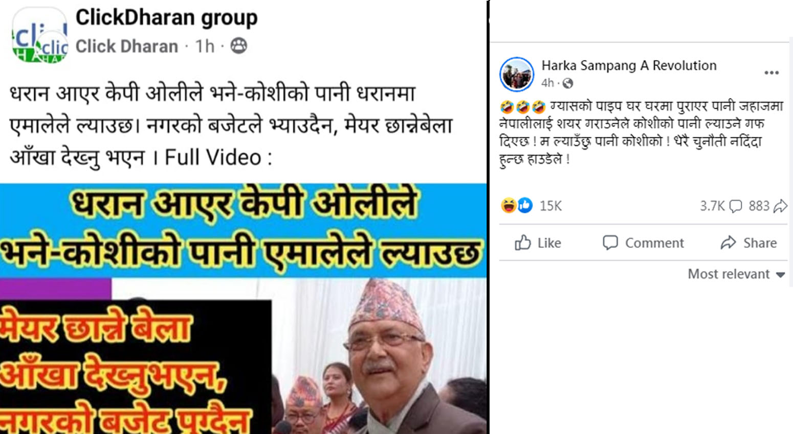 ‘यहाँका मेयरलाई खानेपानी भनेर कतिवटा घैला बोकुन विचरा ? कसको घरमा खानेपानी पुर्याउने ?’ ओलीले सभामा भनेका थिए, ‘कोशीबाट पम्पिङ गरेर पानी ल्याएर एमालेले धरानवासीलाई खुवाउँछ, तपाईंहरू ढुक्क हुनुस् ।’ ओलीले नगरको बजेटले नपुग्ने भन्दै धरानको खानेपानीका लागि राष्ट्रिय बजेट चाहिने भन्दै साम्पाङप्रति कटाक्ष पनि गरेका थिए । ‘नगरको बजेटले त्यो आयोजना हुन्छ त ? हुँदैन । तर म केही भन्दिनँ, छान्ने बेला आँखा देख्नुभएन,’ ओलीले भने, ‘त्यत्रो कोसी त्यहाँबाट बग्छ धरान काकाकुल हुने कसरी मिल्छ ? ।’