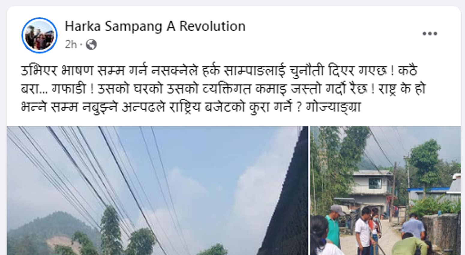 ओलीलाई सामाजिक सञ्जाल फेसबुकमा जवाफ दिँदै धरान नगर प्रमुख साम्पाङले भने गफाडी, हाउडी र गोज्याङ्ग्रा भनेका हुन् । ‘उभिएर भाषणसम्म गर्न नसक्नेले हर्क साम्पाङलाई चुनौती दिएर गएछ ! कठै बरा… गफाडी ! उसको घरको उसको व्यक्तिगत कमाइ जस्तो गर्दो रैछ ! राष्ट्र के हो भन्नेसम्म नबुझ्ने अनपढले राष्ट्रिय बजेटको कुरा गर्ने ? गोज्याङ्ग्रा…,’ साम्पाङले लेखेको स्टाटसमा उल्लेख छ ।