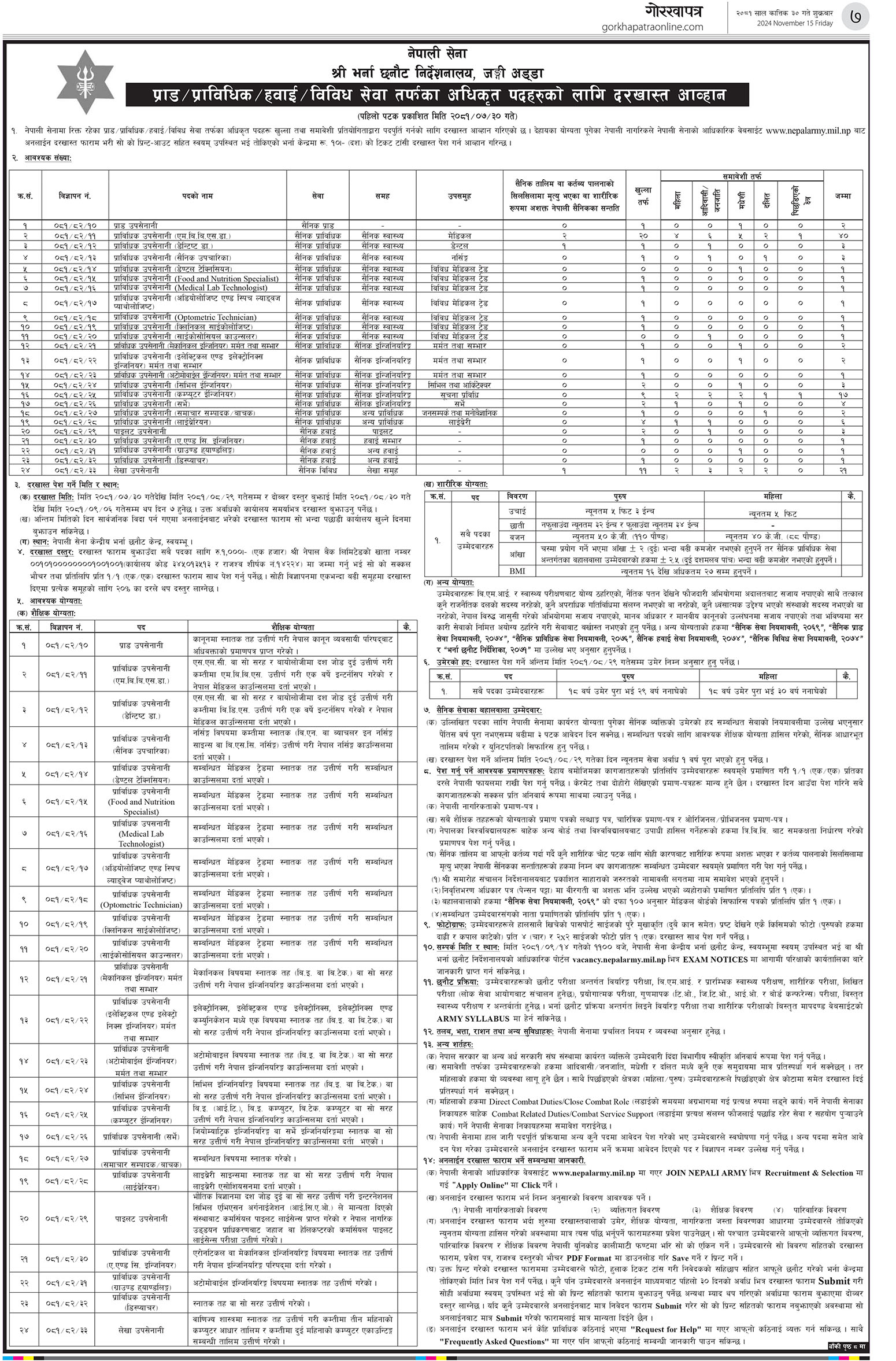 जंगी अड्डाका अनुसार दुई हजार ५१० जना सैन्यको माग भएको छ । यसैगरी कुचिकार लोहार केशकर्तक बकासी लगायतका विभिन्न पदका लागि १२५ जनाले जागिर पाउने भएका छन् । यसैगरी प्राड/प्राविधक/हवाइ र विविध सेवाका अधिकृत ११९ जना माग गरिएको छ । जसमा समाचार सम्पादक, बाचक लाइब्रेरियन लगायत छन् ।
