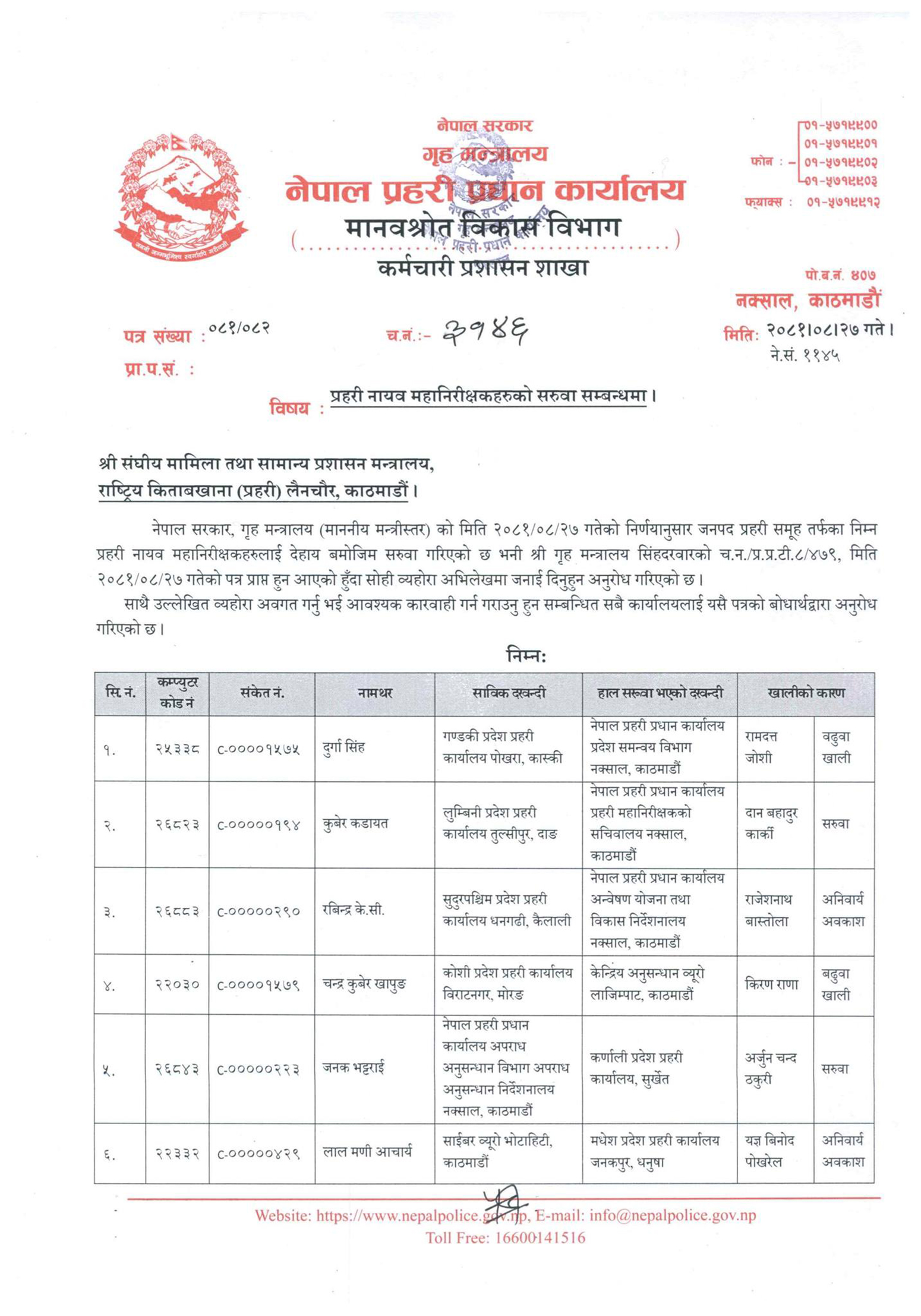सदूरपश्चिमका प्रहरी प्रमुख रवीन्द्र केसीलाई विकास निर्देशनालयमा सरुवा गर्दै त्यहाँ हालै बढुवा भएका गणेश चन्दलाई खटाइएको छ । यसअघि काजमा खटाइएका लालमणि आचार्य मधेसमा र जनक भट्टराईको कर्णाली प्रदेश प्रहरी प्रमुखमा सरुवा कायम गरिएको छ ।
