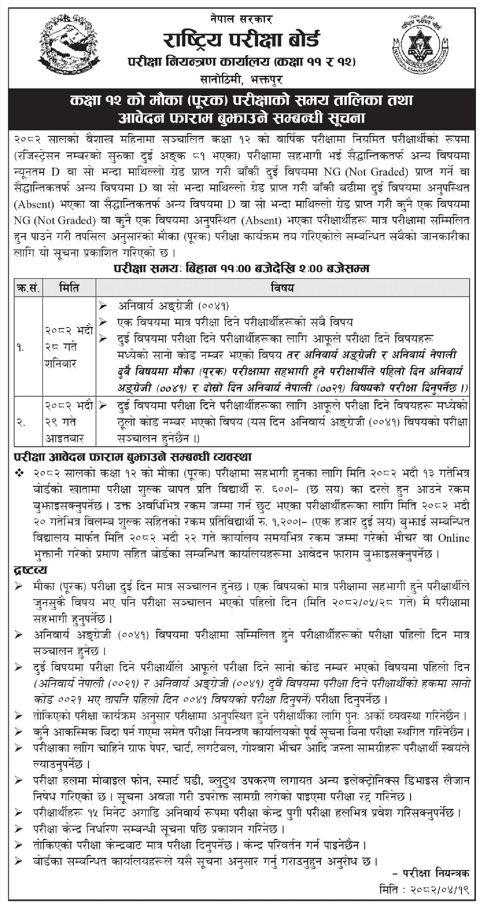 यसैबीच राष्ट्रिय परीक्षा बोर्डले कक्षा १२ को मौका परीक्षाको तालिका सार्वजनिक गरेको छ । परीक्षा भदौ २८ र २९ गते बिहान ११ बजेदेखि दिउँसो २ बजेसम्म सञ्चालन हुनेछ । गत वैशाखमा सञ्चालित वार्षिक परीक्षामा दुई विषयसम्म ‘नन ग्रेडेड’प्राप्त गरेका वा अनुपस्थित भएका विद्यार्थीहरूका लागि बोर्डले पूरक परीक्षाको अवसर दिएको हो । बोर्ड, परीक्षा नियन्त्रण कार्यालय सानोठिमी, भक्तपुरले आज एक सूचना जारी गर्दै परीक्षा तालिका र आवेदन प्रक्रियाबारे जानकारी दिएको छ ।