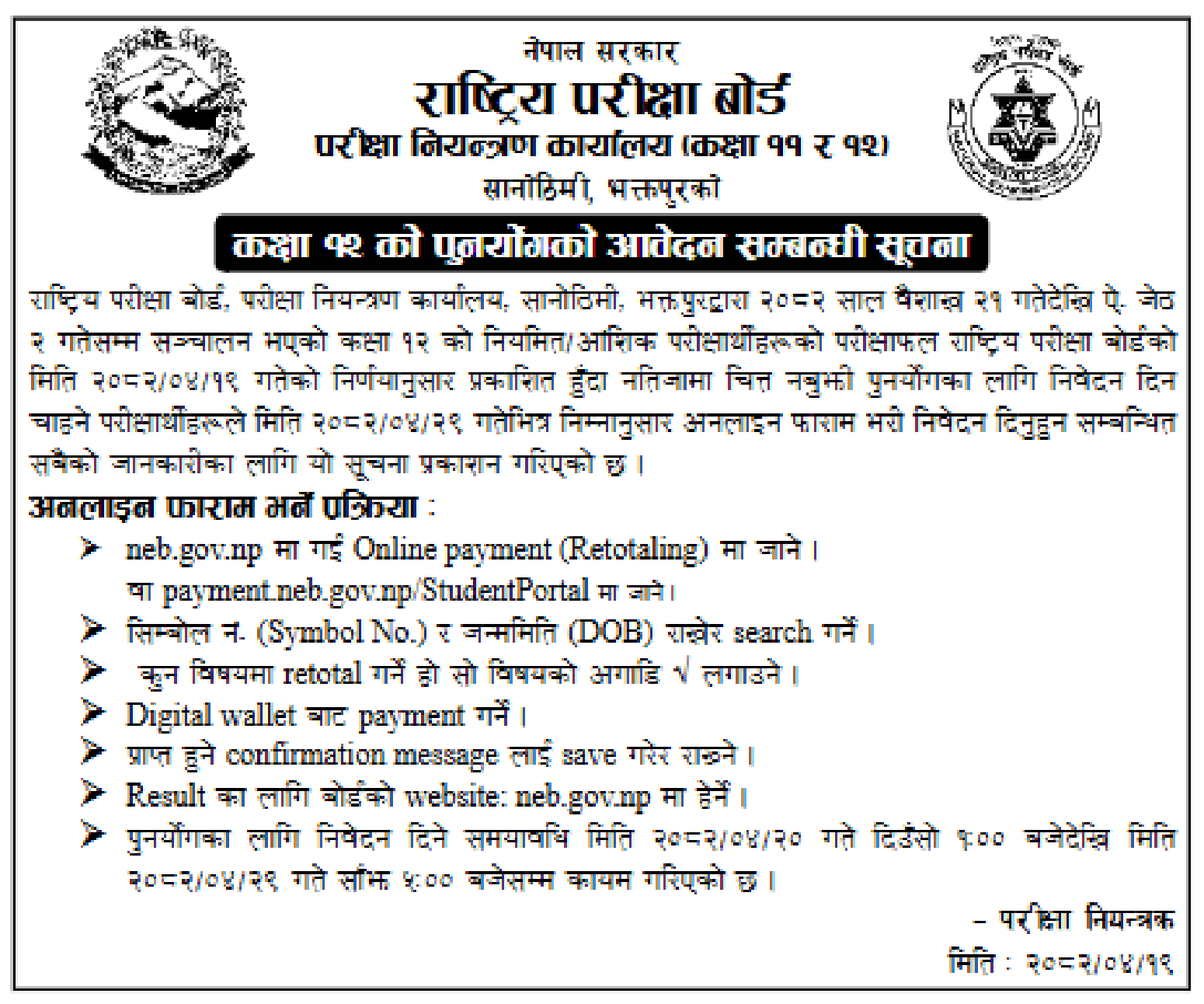 काठमाडौं: राष्ट्रिय परीक्षा बोर्डले कक्षा १२ को परीक्षाफलमा चित्त नबुझेका विद्यार्थीहरूका लागि पुनर्योगको लागि साउन २९ गतेसम्म आवेदन दिन सक्ने जनाएको छ । बोर्ड, परीक्षा नियन्त्रण कार्यालय, सानोठिमीले आज एक सूचना जारी गर्दै पुनर्योग गर्न चाहनेले अनलाइनमार्फत निवेदन दिन आग्रह गरेको हो । गत वैशाख २१ गतेदेखि जेठ २ गतेसम्म सञ्चालित कक्षा १२ को नियमित तथा आंशिक परीक्षाको नतिजा साउन १९ गते प्रकाशित भएको थियो ।