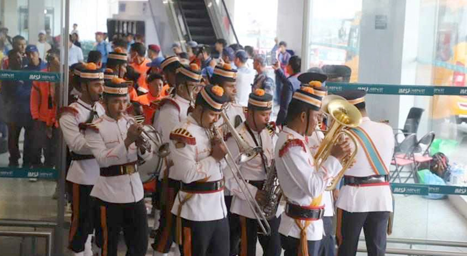 एसिया कप खेलेर स्वदेश फर्केको टोलीलाई आज विमानस्थलमा सशस्त्र प्रहरीको ब्याण्डले बाजागाजासहित स्वागत गरेको थियो । ब्याण्ड टोलीले मंगलधुन बजाएर टोलीको स्वागत गरेको थियो । नेपाल क्रिकेट संघका पदाधिकारी तथा क्रिकेट समर्थकले टिमलाई स्वागत गरेका थिए ।