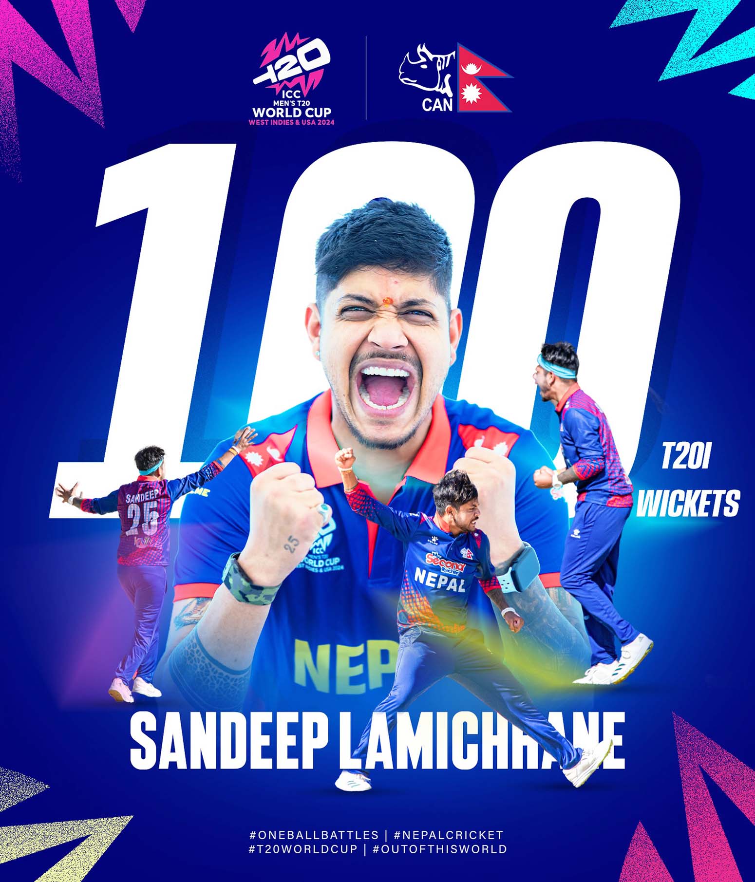 यसैबीच नेपाली क्रिकेट टीमका लेग स्पिनर सन्दीप लामिछानेले टी-२० आई क्रिकेटमा १०० विकेट पूरा गरेका छन् । सन्दीपले बंगलादेशविरुद्ध २ विकेट लिँदै १०० विकेट पूरा गरेका हुन् । योसँगै उनी टी-२० आई क्रिकेटमा छोटो १०० विकेट पूरा गर्ने दोस्रो खेलाडी बनेका छन् । उनले ५४ टी-२० आई खेलमा १०० विकेट पूरा गरेका हुन् । छिटो १०० विकेट पूरा गर्ने खेलाडीको सुचीको पहिलो स्थानमा अफगानिस्तानका रसिद खानको नाममा छ ।