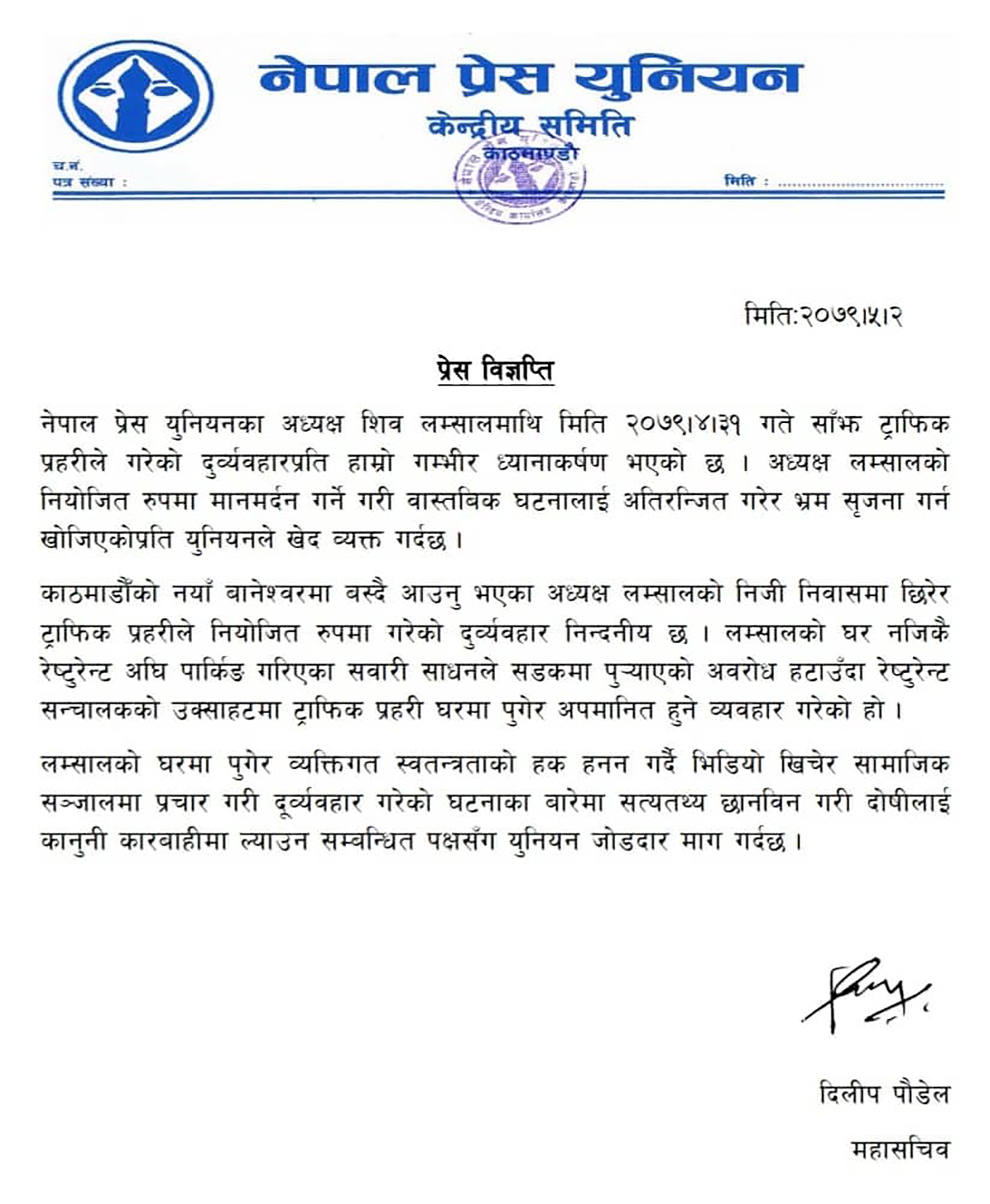 महासचिव पौडेलले जारी गरेको विज्ञप्तिमा भनिएको छ- ‘काठमाडौंको नयाँ बानेश्वरमा बस्दै आउनु भएका अध्यक्ष लम्सालको निजी निवासमा छिरेर ट्राफिक प्रहरीले नियोजित रुपमा गरेको दुर्व्यवहार निन्दनीय छ । लम्सालको घर नजिकै रेष्टुरेन्ट अघि पार्किङ गरिएका सवारी साधनले सडकमा पुर्याएको अवरोध हटाउँदा रेष्टुरेन्ट सञ्चालकको उक्साहटमा ट्राफिक प्रहरी घरमा पुगेर अपमानित हुने व्यवहार गरेको हो । लम्सालको घरमा पुगेर व्यक्तिगत स्वतन्त्रताको हक हनन गर्दै भिडियो खिचेर सामाजिक सञ्जालमा प्रचार गरी दुर्व्यवहार गरेको घटनाका बारेमा सत्यतथ्य छानविन गरी दोषीलाई कानुनी कारबाहीमा ल्याउन सम्बन्धित पक्षसँग युनियन जोडदार माग गर्दछ ।’