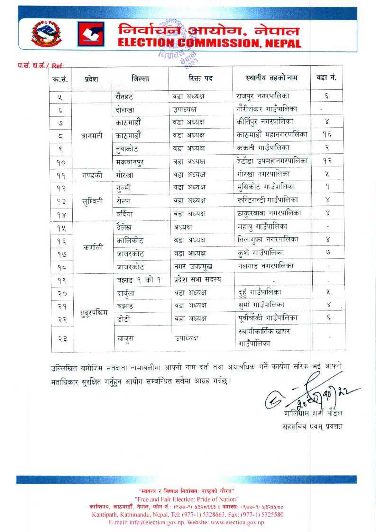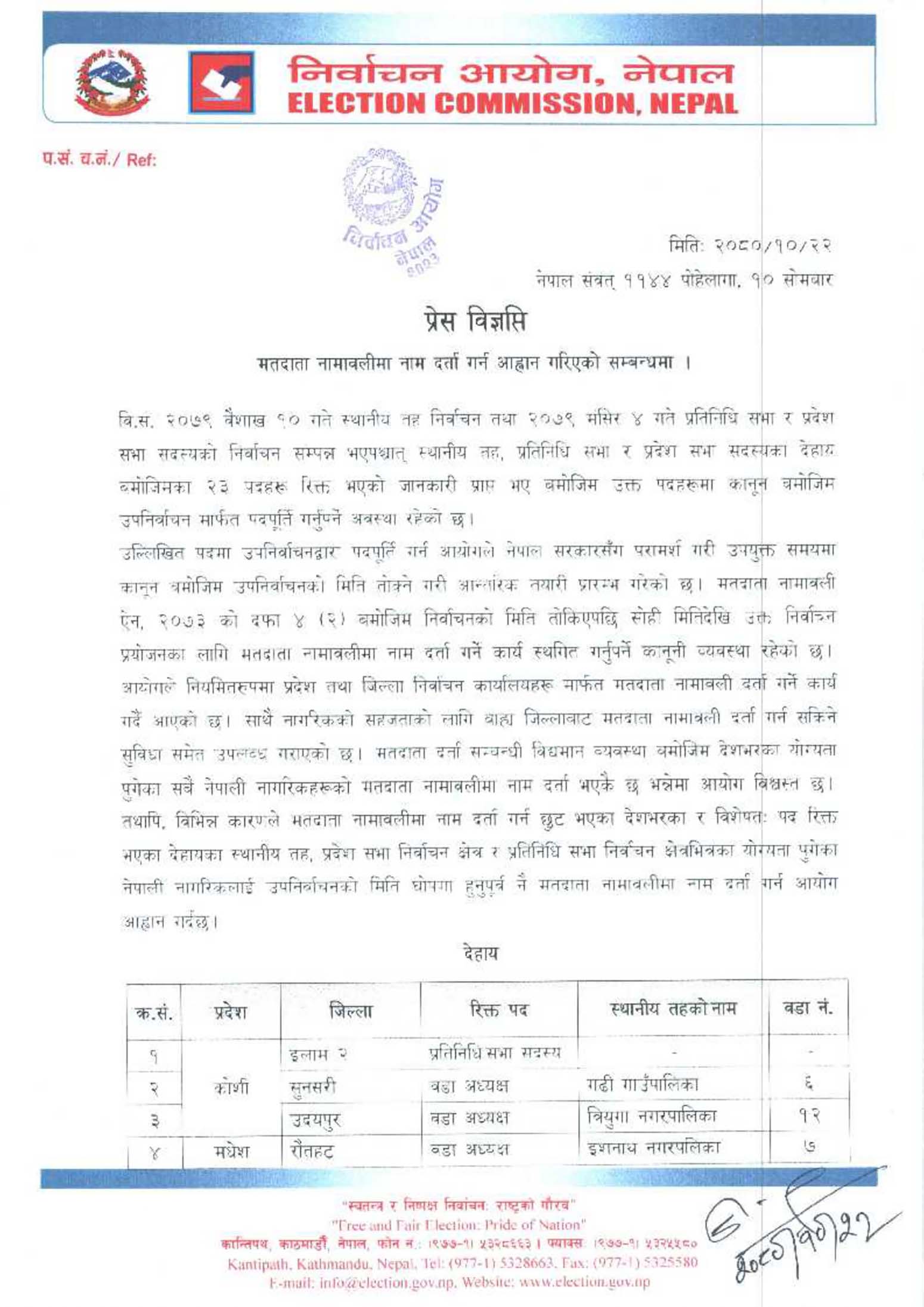 यद्यपि, विभिन्न कारणले मतदाता नामावलीमा नाम दर्ता गर्न छुट भएका देशभरका र विशेषतः पद रिक्त भएका देहायका स्थानीय तह, प्रदेश सभा निर्वाचन क्षेत्र र प्रतिनिधि सभा निर्वाचन क्षेत्रभित्रका योग्यता पुगेका नेपाली नागरिकलाई उपनिर्वाचनको मिति घोषणा हुनु पूर्व नै मतदाता नामावलीमा नाम दर्ता आह्वान गरेको विज्ञप्तिमा उल्लेख छ ।
