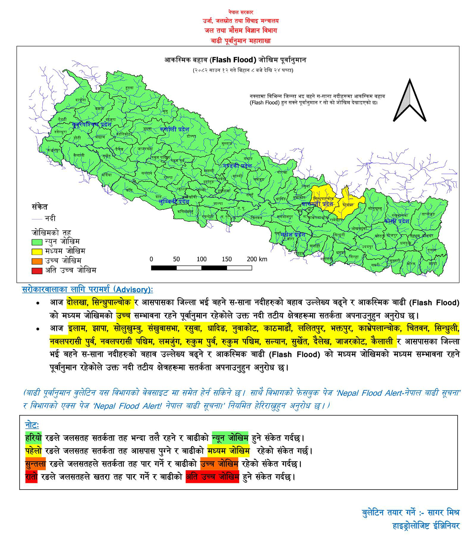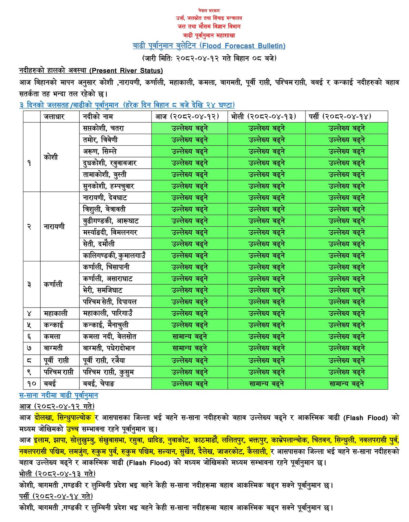 त्यस्तै, इलाम, झापा, सोलुखुम्बु, सङ्खुवासभा, रसुवा, धादिङ, नुवाकोट, काठमाडौँ, ललितपुर, भक्तपुर, काभ्रेपलान्चोक, चितवन, सिन्धुली, नवलपरासी पूर्व, नवलपरासी पश्चिम, लमजुङ, रुकुम पूर्व, रुकुम पश्चिम, सल्यान, सुर्खेत, दैलेख, जाजरकोट, कैलाली, र आसपासका जिल्ला भई बहने स-साना नदीहरूको बहाव उल्लेख्य बढ्ने र आकस्मिक बाढीको मध्यम जोखिमको मध्यम सम्भावना रहने पूर्वानुमान छ ।